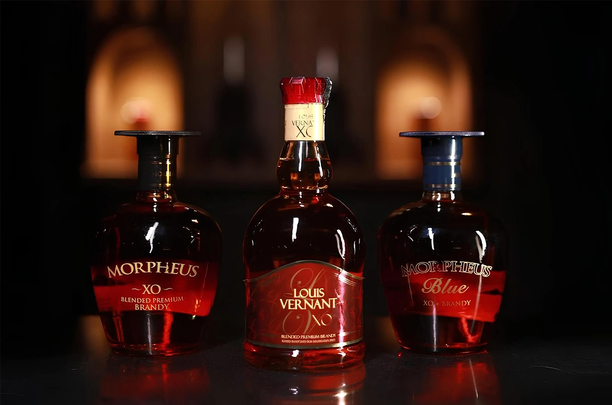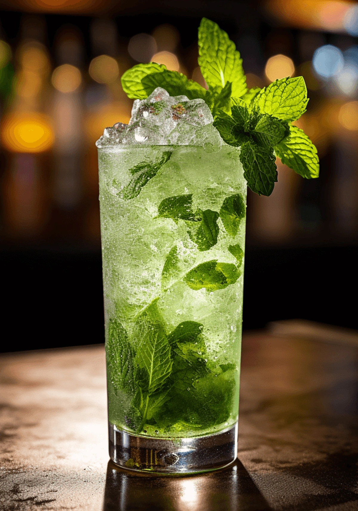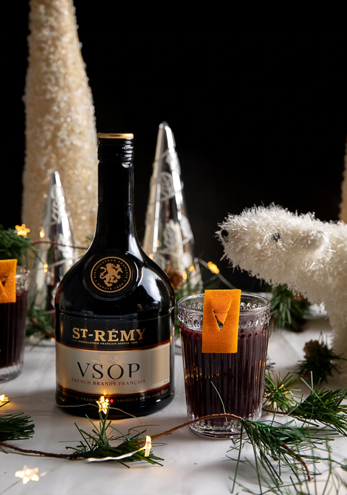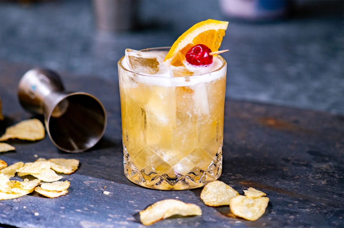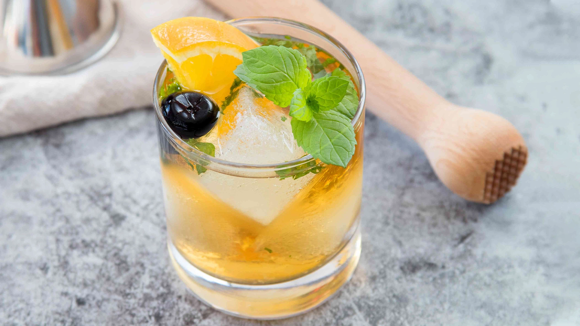 BRANDY,MINT LEAF,SUGAR SYRUP,FRESH ORANGE JUICE,SODA,GARNISHED WITH MARASCHINO CHERRIES.