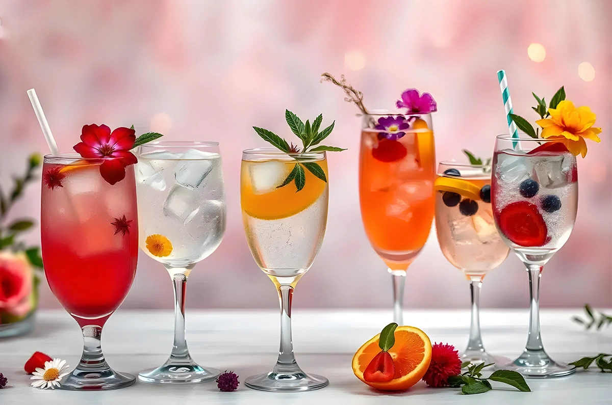 GIN,LIME JUICE,ROSE SYRUP,ALMOND SYRUP,TONIC WATER,GARNISHED WITH PAINTED PETALS.
